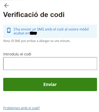 - T'arribarà un SMS al teu mòbil: és un codi d'un sol ús i caduca al cap de 10 minuts. Si no reps l'SMS, tens l'opció de rebre el codi per WhatsApp o per trucada.