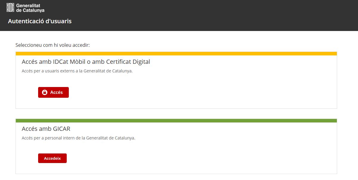 - Clica l'opció Accés amb IDCat Mòbil o amb Certificat Digital.