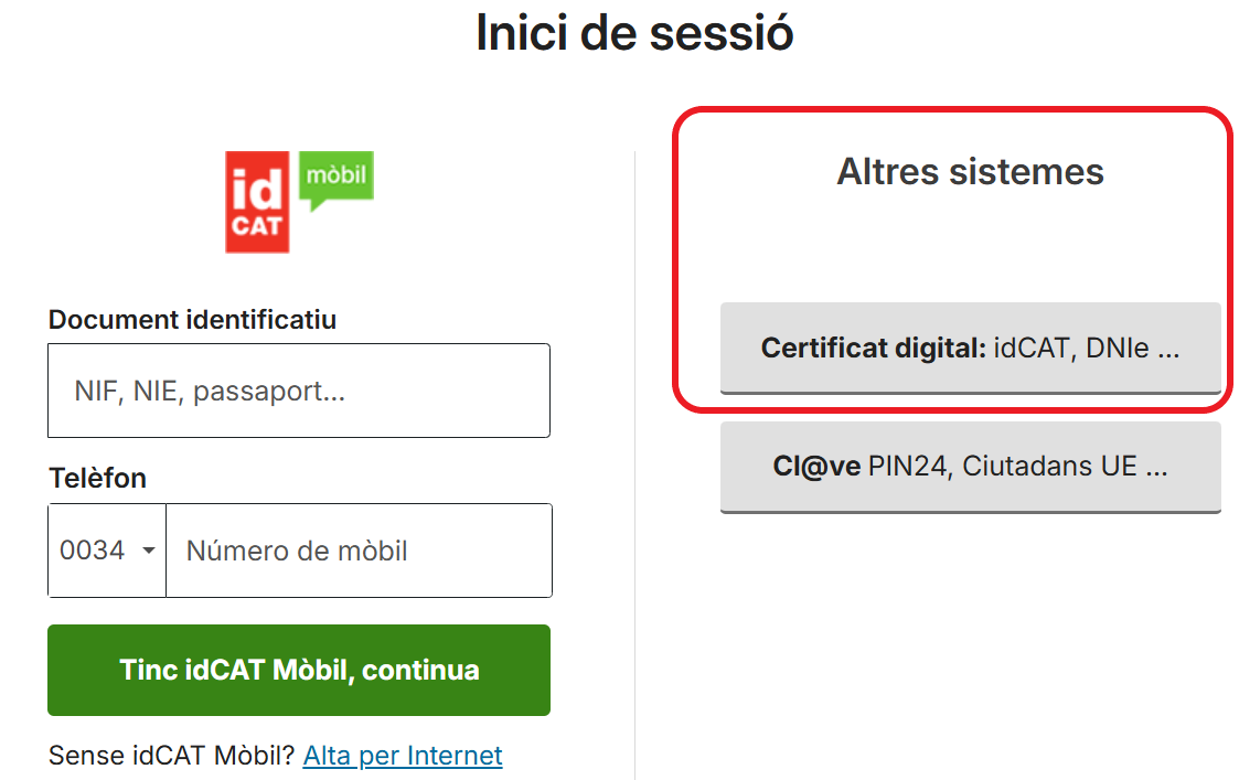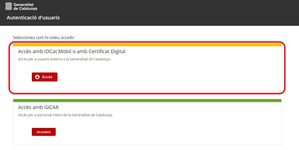 - Fes clic a l'opció Accés amb IDCat Mòbil o amb Certificat Digital.